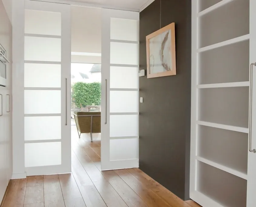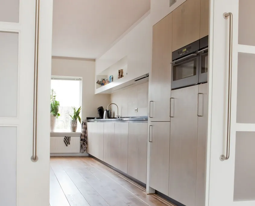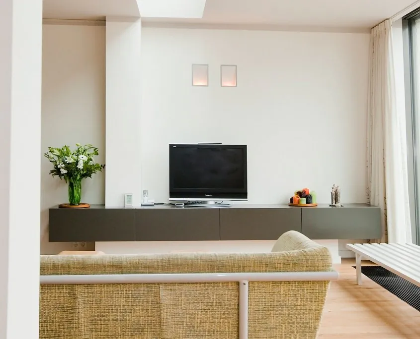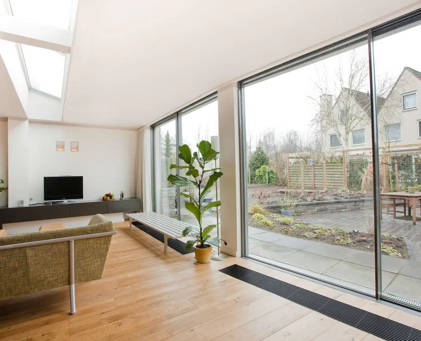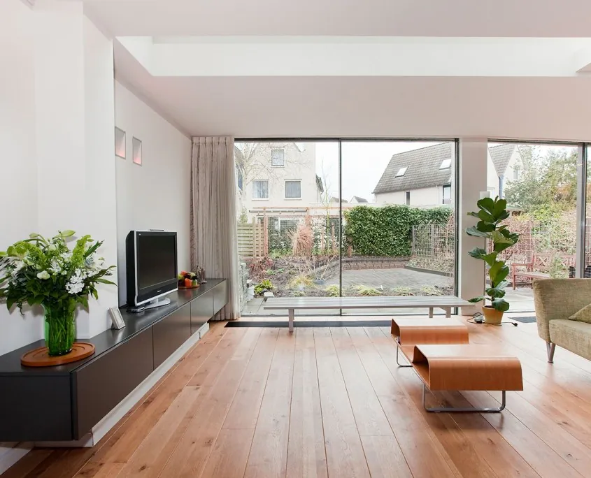 Het op advies van Hubbers interieurmakers verplaatsen van de woonkamer naar de achterzijde van een woning in Zwolle leverde de bewoners een zee aan licht en ruimte op. Om de wisselwerking tussen achtertuin en uitgebouwde kamer te optimaliseren koos Hubbers interieurmakers voor de schuivende ‘Sky Frame’ glasgevels van MHB. Niet alleen het ontwerp komt uit de Hubbers-koker. De naar de voorzijde verplaatste keuken, de schuifdeuren en de tv-schap zijn gemaakt door Hubbers interieurmakers.