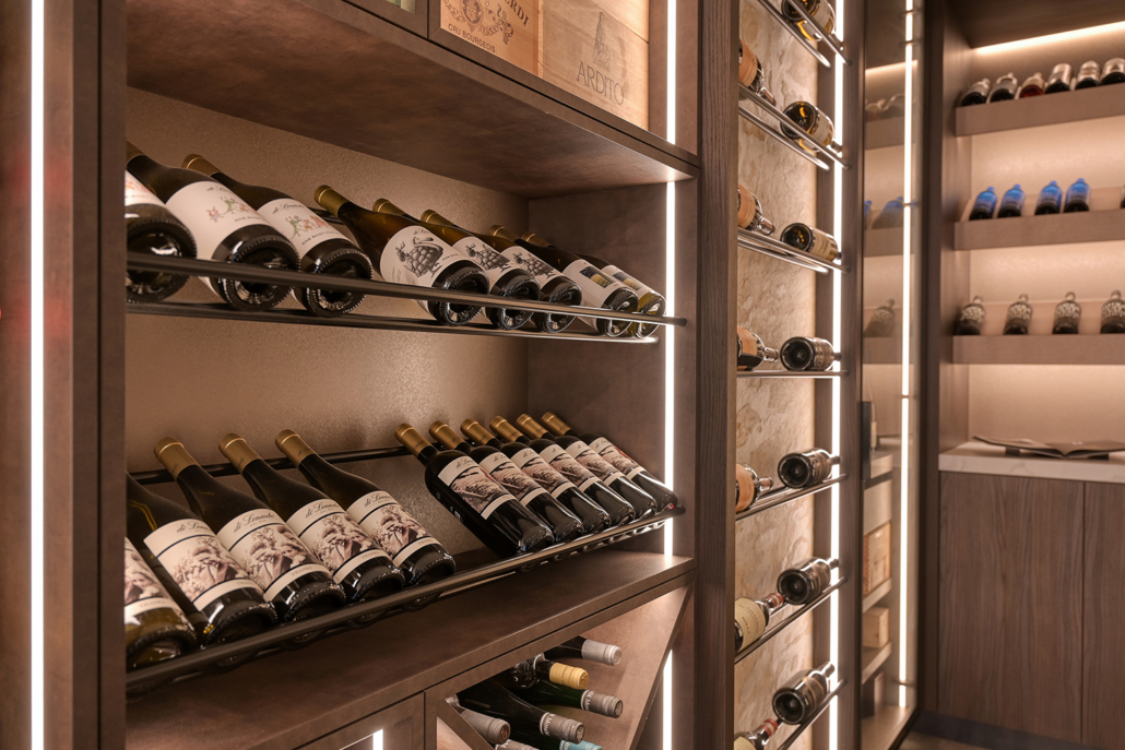 In de kelder van een villa in Uden realiseerden wij, op basis van een eigen ontwerp, een luxe maatwerk wijnkelder met bar. De wijnkasten zijn volledig op maat gemaakt en voorzien van geïntegreerde verlichting voor optimale presentatie en sfeer. Het ontwerp van de bar sluit aan op de materialen, lijnen en kleuren van de wijnkelder, waardoor één samenhangend geheel ontstaat.